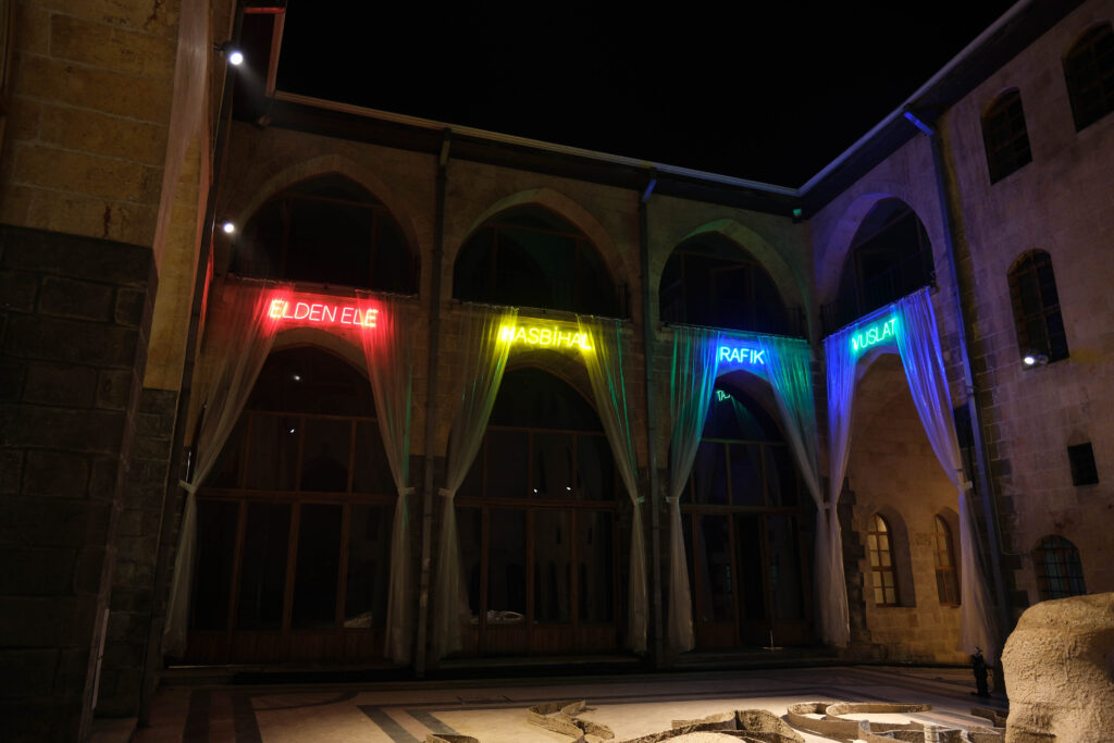 Fırat Engin carries the words “Rafık”, “Hasbihal”, “Elden Ele”, “Vuslat”, which refer to the SAHRE tradition with neon typographies. In his work, which uses the packaging films of Super Film, he aims to protect SANKO’s past and values and transfer them to future generations, while pointing to SANKO’s determination to protect cultural heritage.